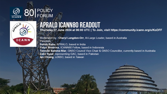 **If you require a dial-out or need to state an apology, please contact At-Large staff at staff@atlarge.icann.org<mailto:staff@atlarge.icann.org> with your preferred number.** ** Please register for Zoom ** *Registration* for Zoom: https://icann.zoom.us/meeting/register/tJYof-CvrzMuE9BdvSheeFrfIca8pbULBwLZ Please join us and spread the word! Dear All, You are invited to participate in the interactive ICANN80 Read-out organized by the APRALO Policy Forum on Thursday 27 June 2024 at 06:00 UTC for 90 minutes, featuring At-Large, GNSO, GAC, ccNSO and ICANN80 Fellow panellists from the APAC region. Panellists will discuss their respective key takeaways from ICANN80 and participants are welcomed to join in the conversation aimed at identifying where and how end-users may play a role in any next steps to each of those takeaways. For other times: https://tinyurl.com/4b4rbe5v The full agenda with panellists and moderator profiles can be found at: https://community.icann.org/x/KoDFF APRALO Policy Forum Wiki Workspace: https://community.icann.org/x/TwDQC ADIGO Conference Bridge: English ID: 1638 ADIGO toll-free numbers: http://adigo.com/icann/ *Registration* for Zoom: https://icann.zoom.us/meeting/register/tJYof-CvrzMuE9BdvSheeFrfIca8pbULBwLZ Thank you. Kind Regards, At-Large Staff ICANN Policy Staff in support of the At-Large Community Website: atlarge.icann.org<https://atlarge.icann.org/> Facebook: facebook.com/icann<https://www.facebook.com/icannatlarge>atlarge<https://www.facebook.com/icannatlarge> Twitter: @<https://twitter.com/ICANNAtLarge>ICANNAtLarge<https://twitter.com/ICANNAtLarge>