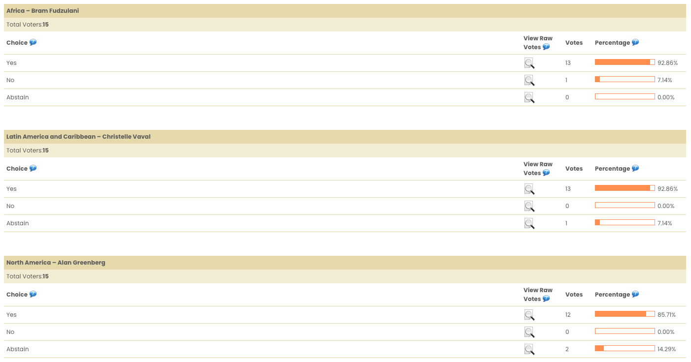 Dear All, On behalf of Jonathan Zuck, ALAC Chair, we are pleased to announce the results of the ALAC NomCom Delegates Ratification poll. Following the close of the votes, the following RALO candidates have been endorsed by the ALAC for the position of ALAC Delegate to the NomCom representing their regions. Their terms will begin at the end of the 2025 AGM. * Bram Fudzulani - ALAC appointed delegate to the NomCom from the African region for the term 2025 AGM - 2027 AGM. * Christelle Vaval - ALAC appointed delegate to the NomCom from the Latin American and Caribbean region for the term 2025 AGM - 2027 AGM. * Alan Greenberg - ALAC appointed delegate to the NomCom from the North American region for the period 2025 AGM - 2027 AGM. [cid:image001.png@01DBCE7F.9BF7D340] For more information see: 2025 ALAC and RALO Elections, Selections and Appointments [icann-community.atlassian.net]<https://urldefense.com/v3/__https:/icann-community.atlassian.net/wiki/x/JQCt...> At-Large staff would like to congratulate Bram Fudzulani, Christelle Vaval and Alan Greenberg and thank all candidates for their interest. Thank you. Kind Regards, At-Large Staff ICANN Policy Staff in support of the At-Large Community