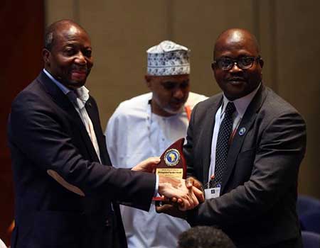 | | ICANN's Pierre Dandjinou (left) is recognized by Dr. Jimson Olufuye for ICANN's work in Africa. |