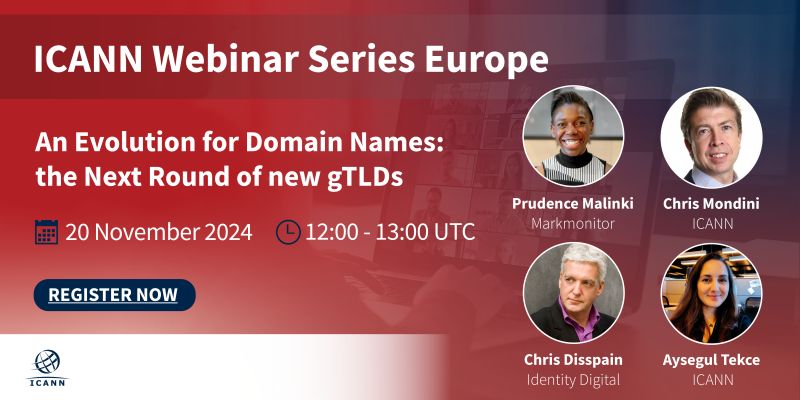 Dear All, On behalf of Gabriella Schittek<https://www.icann.org/profiles/315>, Stakeholder Engagement Director, Nordic & Central Europe, please see hereafter the next webinar for Europe on "An Evolution for Domain Names: the Next Round of new gTLDs", taking place on this Wednesday, 20 November 2024 at 12.00 - 13.00 UTC. More information + registration: https://www.icann.org/en/engagement-calendar/details/an-evolution-for-domain... We hope to see you online! [No alternative text description for this image]