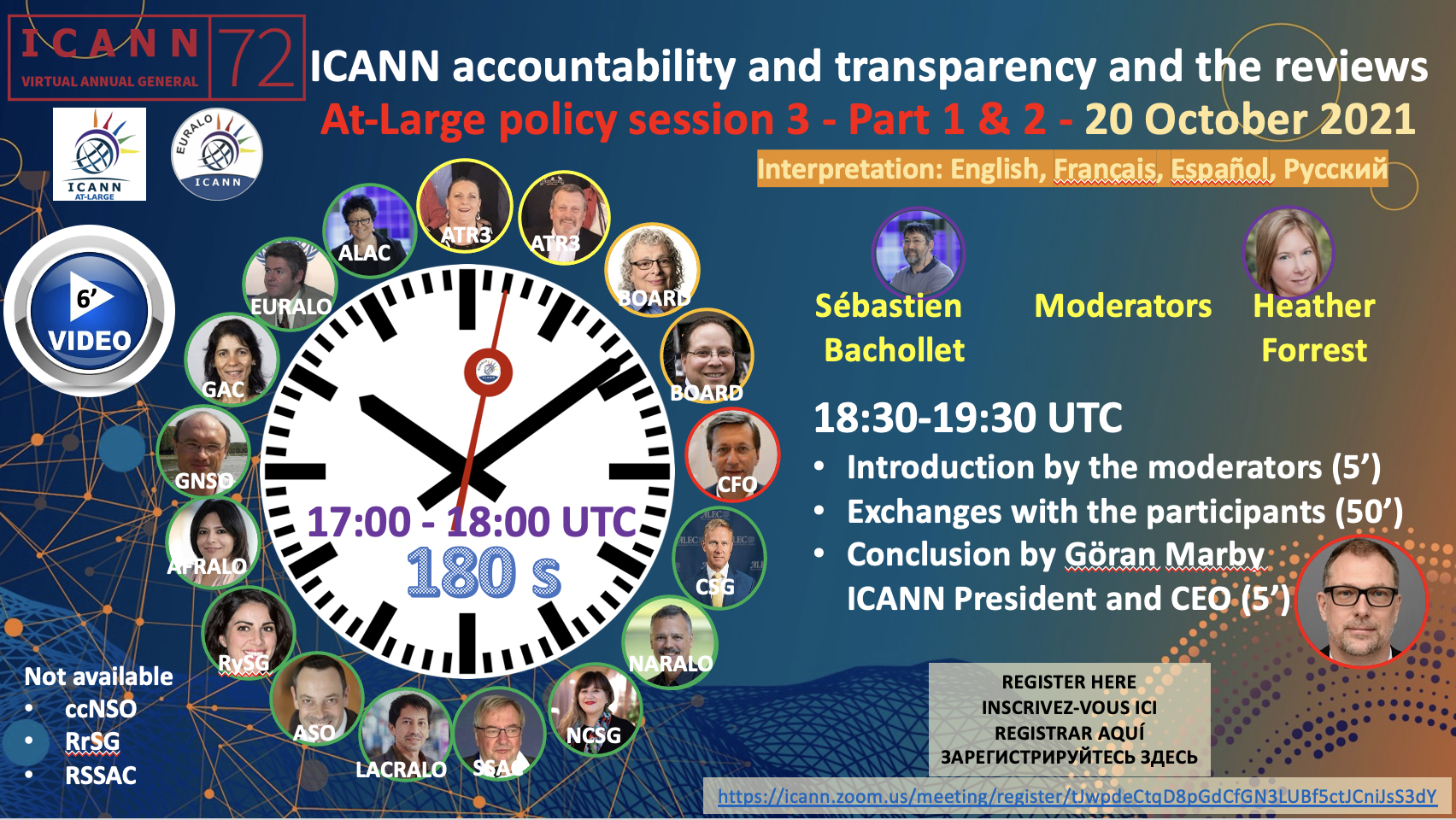 PLEASE REGISTER AND JOIN US! Registrarse para zoom Inscrivez-vous pour Zoom! Dear All, Please join us for the three At-Large Policy Sessions next week! Don’t forget to register. Please see the full At-Large Schedule for next week (intersessional week) and ICANN72 here.<https://community.icann.org/display/atlarge/ICANN72+-+Oct+2021%3A+Annual+Gen...> * Monday 18 October from 19:00-20:30 UTC - At-Large Policy Session 1: Closed Generics: What's Next?<https://community.icann.org/display/atlarge/At-Large+Meetings+-+Monday%2C+18...> Moderator: Jonathan Zuck, ALAC Guest Speakers: Avri Doria - ICANN Board, Becky Burr - ICANN Board, TBC – GAC, Kathy Kleiman - NCSG, Paul McGrady - IPC Zoom Registration: https://icann.zoom.us/meeting/register/tJMlcOqopjsqHtMbSm1KbRR68oR5YkDenlAo Interpretation: English, Français, Español (to join the language channels, please see here: https://community.icann.org/x/fAyHCg). Zoom room in English only. Description: What will happen with Closed Generics in subsequent rounds? The 2012 Applicant Guidebook was silent on the concept of generic terms (i.e. books, perfume, etc.) being used by a single company, or “closed.” The GAC advised against them unless they were in the global public interest but left that undefined. Given the lack of consensus, coming out of the Subsequent Procedures Workgroup, there is currently no policy in place, leaving the development of a policy on Closed Generics in the hands of the board. In this session, we will discuss the possible scenarios in which closed generics could be authorized and endeavour to advance the discussion, prior to board consideration. ----------------------------------------------- * Tuesday 19 October from 17:00-18:30 UTC - At-Large Policy Session 2: Tackling DNS Abuse<https://community.icann.org/display/atlarge/At-Large+Meetings+-+Tuesday%2C+1...> Moderator: Joanna Kulesza, ALAC Guest Speakers: Lori Schulman - IPC, Brian Cimbolic - Public Interest Registry, Graeme Bunton - DNS Abuse Institute, James Bladel - VP of Global Policy at GoDaddy Zoom Registration: https://icann.zoom.us/meeting/register/tJIrcuGorz0oG9VC2VspyYovClX6tTyMzWdL Interpretation: English, Français, Español (to join the language channels, please see here: https://community.icann.org/x/fwyHCg). Zoom room in English only. Description: This proposal aims to bridge the widening gap between policy development around activity considered abusive to the Domain Name System (DNS Abuse) and relevant legal and policy measures. With the overall goal of breaking the silos, it brings together technical community, governments and business from around the globe to offer different perspectives on DNS Abuse and platform liability. Looking at automated content moderation within platforms, is asks the questions of recommendable policy solutions to best address end user needs and concerns. ----------------------------------------------- * Wednesday 20 October from 17:00-18:00 UTC and 18:30-19:30 UTC - At-Large Policy Session 3: ICANN Accountability and Transparency and the ICANN Reviews (part 1)<https://community.icann.org/display/atlarge/At-Large+Meetings+-+Wednesday%2C+20+October+2021>(part 2) Moderators: Sébastien Bachollet and Heather Forrest Guest speakers: please see list here<https://community.icann.org/display/atlarge/At-Large+Meetings+-+Wednesday%2C...> Zoom Registration (valid for part 1 & 2): https://icann.zoom.us/meeting/register/tJwpdeCtqD8pGdCfGN3LUBf5ctJCniJsS3dY Interpretation: English, Français, Español, Русский (to join the language channels, please see here: https://community.icann.org/x/9gVyCg). Zoom room in English only. [cid:image001.png@01D7C10D.BEC0C900] Description: This proposal aims to both explore the ATRT3 recommendations regarding Reviews and the Board approval of the ATRT3 Final Report as well as expand the understanding of the perspectives of all ICANN Constituencies on the implementation of the recommendations. The ATRT3 Final Report included a recommendation for changes to Specific and Organizational Reviews, including creation of a new Holistic Review of ICANN, and evolution of Organizational Reviews into Continuous Improvement Programs. While all Review will be discussed. a primary focus of the session will be placed on discussion of the Holistic Review, including discussion of timing, organization, budget and other actions to support its implementation. Please see the full At-Large Schedule for At-Large week (intersessional week) and ICANN72 here.<https://community.icann.org/display/atlarge/ICANN72+-+Oct+2021%3A+Annual+Gen...> Thank you. Kind regards, ICANN Policy Staff in support of the At-Large Community Website: atlarge.icann.org [atlarge.icann.org]<https://urldefense.proofpoint.com/v2/url?u=https-3A__atlarge.icann.org_&d=Dw...> Facebook: facebook.com/icann [facebook.com]<https://urldefense.proofpoint.com/v2/url?u=https-3A__www.facebook.com_icannatlarge&d=DwMGaQ&c=FmY1u3PJp6wrcrwll3mSVzgfkbPSS6sJms7xcl4I5cM&r=ds9md1zoepmwqw2nfk-Vs9ssxn1I3jPs97ekKkctEkM&m=eVjcqQ6q8nY7QUSrlA2nPJNCy7kLh0qN2VYRahN9_94&s=cQT9ewNA5UeVKxa3D4IGyjS4kHn3xOCI4z2ZyLFEX0k&e=>atlarge [facebook.com]<https://urldefense.proofpoint.com/v2/url?u=https-3A__www.facebook.com_icanna...> Twitter: @ [twitter.com]<https://urldefense.proofpoint.com/v2/url?u=https-3A__twitter.com_ICANNAtLarge&d=DwMGaQ&c=FmY1u3PJp6wrcrwll3mSVzgfkbPSS6sJms7xcl4I5cM&r=ds9md1zoepmwqw2nfk-Vs9ssxn1I3jPs97ekKkctEkM&m=eVjcqQ6q8nY7QUSrlA2nPJNCy7kLh0qN2VYRahN9_94&s=S3JMa5G0D-NLynujJc8RwSnj4cn354eHaVMXf2JIsm4&e=>ICANNAtLarge [twitter.com]<https://urldefense.proofpoint.com/v2/url?u=https-3A__twitter.com_ICANNAtLarg...>