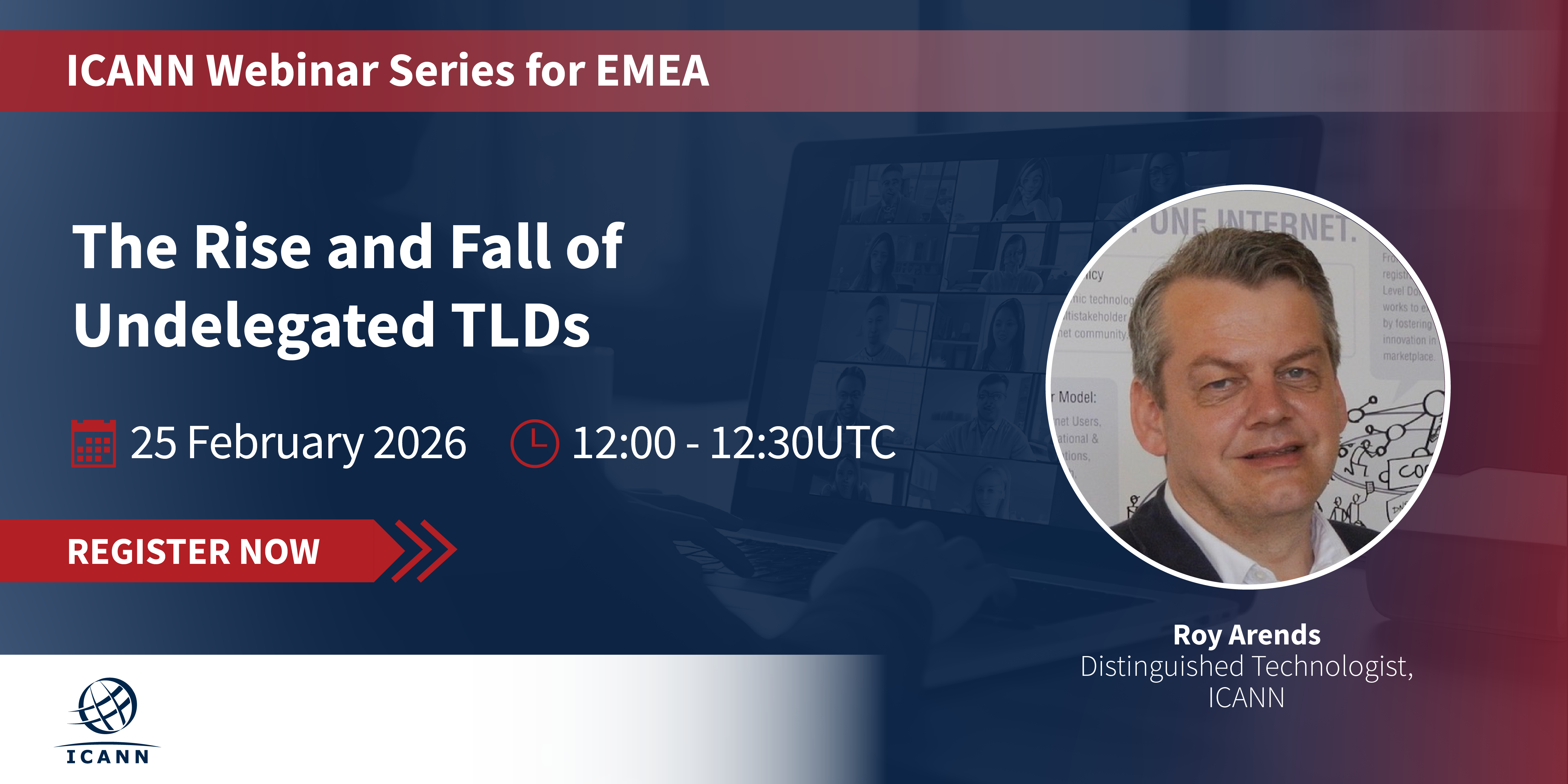 Dear all, Please see hereafter an invitation on behalf of Gabriella Schittek, Stakeholder Engagement Director, Nordic & Central Europe. Thank you! Kind regards, Gisella ********************************* Dear all, Our next webinar for EMEA will be held on 25 February 2026, 12.00 – 12.30 UTC and will investigate The Rise and Fall of Undelegated TLDs. More info + registration: https://www.icann.org/en/engagement-calendar/details/icann-webinar-series-fo... As always, please, spread the word to anyone you think might be interested! Kind regards, Gabi [cid:image001.png@01DCA642.6E049A40]