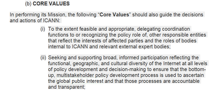 Dear all, I believe what is being discussed is the Neustar proposal regarding “windows” in the next round. In this regard, views of participants are relevant and a second public comment period on a limited number of important issues is highly likely given that (1) there was no Consensus Call prior to the issuance of the Initial Report and (2) There was no discussion by the full Working Group of all the issues raised in all the Work Tracks that resulted in the questions published with the Initial Report. In fact, Leadership promised that the Initial Report would not be prejudicial to a discussion of the issues by the full WG. It was on that basis that WG members agreed to drop the PDP requirement of a Consensus Call prior to the issuance of an Initial Report. Considering “organizational mandate”, I will venture the opinion (once again and as raised in the Barcelona meeting at the mike in a GNSO meeting) that the GNSO itself is not charged with acting in the “global public interest” except to the extent its PDP procedures provide for fair consideration of all points of view expressed in the PDP Working Group. (In this regard, I believe Minority Statements play a very important role in that process.) GNSO consists of stakeholders and constituencies representing various interests. I personally believe the group that has been closest to supposedly providing input to the GNSO in relation to the “global public interest” is the ALAC, but the ALAC does not have a vote on GNSO Council (oddly). The GAC’s realm is “public policy”. So it seems to me that only the ICANN Board has responsibility for acting in the Global Public Interest when adopting policy, albeit within the limited scope of the ICANN Mission. I believe the current ByLaws provide a reference to “global public interest” as follows in (ii) below: [cid:image001.png@01D4FABA.03CE74B0] If someone can point me to some language in the PDP Manual that incorporates a requirement for GNSO itself to determine and act in the Global Public Interest, I would very much appreciate it. Some definition work was previously done on this but this was prior to the most recent Accountability work. As I understand it, the old work resulted in the following draft, which was never formally adopted: “ICANN defines the global public interest in relation to the Internet as ensuring the Internet becomes, and continues to be, stable, inclusive, and accessible across the globe so that all may enjoy the benefits of a single and open Internet. In addressing its public responsibility, ICANN must build trust in the Internet and its governance ecosystem.” Anne From: Mike Rodenbaugh [mailto:mike@rodenbaugh.com] Sent: Wednesday, April 24, 2019 11:08 AM To: lists@christopherwilkinson.eu Cc: Aikman-Scalese, Anne <AAikman@lrrc.com>; gnso-newgtld-wg@icann.org Subject: Re: [Gnso-newgtld-wg] FW: AFRALO-AFRICANN statement - ICANN 64 Kobe, Japan [EXTERNAL] ________________________________ Sorry, I now note this is on the broader list. If this hasn't already been discussed in the Initial Report, is it appropriate to open such a broad discussion now? Mike Rodenbaugh RODENBAUGH LAW tel/fax: +1.415.738.8087 http://rodenbaugh.com On Wed, Apr 24, 2019 at 11:06 AM Mike Rodenbaugh <mike@rodenbaugh.com<mailto:mike@rodenbaugh.com>> wrote: Yes it would be awesome to define ICANN's and the GAC's 'public interest' thoroughly and completely, at least with respect to the newTLD program. That has always been the white whale of ICANN policy development. I believe there is a formal organization effort underway to define it for ICANN, or did that conclude? (Staff, any update?) The problem is that both Board and GAC have always, and always will, insist on the right and flexibility to define it as they see it, in any given case. Just like they did (and are still doing re Amazon, Islam, Halal, GCC and probably others) at least a dozen times out of the 2012 round. WT5 would only have scope to discuss public interest as to geo names, which is only a small slice of the newTLD pie. I don't know if there has been discussion of defining 'public interest' in the broader SubPro group, but it seems a much more appropriate forum than this subgroup. Mike Rodenbaugh RODENBAUGH LAW tel/fax: +1.415.738.8087 http://rodenbaugh.com On Wed, Apr 24, 2019 at 10:18 AM lists@christopherwilkinson.eu<mailto:lists@christopherwilkinson.eu> <lists@christopherwilkinson.eu<mailto:lists@christopherwilkinson.eu>> wrote: