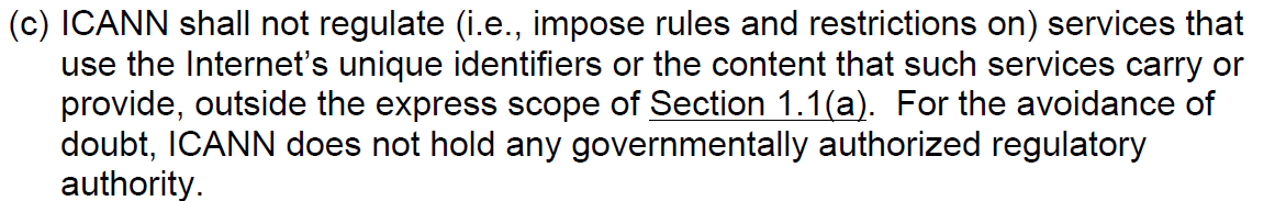 Steve, “consistent with 1.1 (c ) doesn’t hit the mark because 1.1(a) is an exception to 1.1 (c). So the question is more properly phrased to ask how this is consistent with the “express scope of 1.1(a) of the ByLaws as required by 1.1(c)” or something like that. In other words, it’s just confusing to refer to 1.1(c) without acknowledging the exception in 1.1(c) to 1.1(a). Anne Anne E. Aikman-Scalese Of Counsel 520.629.4428 office 520.879.4725 fax AAikman@lrrc.com<mailto:AAikman@lrrc.com> _____________________________ [cid:image001.png@01D2C2A4.14DD05A0] Lewis Roca Rothgerber Christie LLP One South Church Avenue, Suite 700 Tucson, Arizona 85701-1611 lrrc.com<http://lrrc.com/> From: Steve Chan [mailto:steve.chan@icann.org] Sent: Monday, May 01, 2017 5:39 PM To: Aikman-Scalese, Anne; gnso-newgtld-wg@icann.org Subject: Re: [Ext] RE: [Gnso-newgtld-wg] Proposed Agenda: New gTLD Subsequent Procedures Working Group, 2 May 2017 at 03:00 UTC Dear Anne, If I am understanding your comment/suggestion properly, staff has attempted to incorporate the issues raised by you and Kristina Rosette in the last sentence of the comments to Recommendation 14. I’ve extracted that sentence for your consideration here: “Finally, it would be helpful if the CCT-RT would clarify how the reference to “relationship of content of a gTLD to its name” is consistent with Section 1.1(c) of the ICANN Bylaws.” If you do not feel that this sentence adequately captures your concerns, you can suggest updated text in the Google doc directly and/or discuss the topic during the upcoming call. Best, Steve From: "Aikman-Scalese, Anne" <AAikman@lrrc.com<mailto:AAikman@lrrc.com>> Date: Monday, May 1, 2017 at 5:05 PM To: Steve Chan <steve.chan@icann.org<mailto:steve.chan@icann.org>>, "gnso-newgtld-wg@icann.org<mailto:gnso-newgtld-wg@icann.org>" <gnso-newgtld-wg@icann.org<mailto:gnso-newgtld-wg@icann.org>> Subject: [Ext] RE: [Gnso-newgtld-wg] Proposed Agenda: New gTLD Subsequent Procedures Working Group, 2 May 2017 at 03:00 UTC Thank you. Regarding the proposed change to the comments as to Recommendation 14, I think this question would have to be rephrased to ask how the Recommendation fits within the Mission specified in 1.1 (a). The reason for this is that the big “carve-out” from 1.1 (c) is the “express scope of Section 1.1(a)”: [cid:image005.png@01D2C2A4.14AE5480] So it seems the question in the draft comment to Recommendation 14 would have to be “How is this recommendation consistent with the express scope of ICANN’s Mission as set forth in Section 1.1(a) of the ByLaws?” The draft comment currently says: “On the 10 April WG call, members of the CCT-RT provided additional context for this recommendation. According to the CCT-RT members, research findings indicate that end users expect to see a relationship between TLDs and the meaning of the string and/or usage of associated domains. It seems that the spirit of this recommendation is to create incentives to encourage that correlation, so as to promote user trust.” Section 1.1(a) of the ByLaws provides: Section 1.1. MISSION (a) The mission of the Internet Corporation for Assigned Names and Numbers (“ICANN”) is to ensure the stable and secure operation of the Internet’s unique identifier systems as described in this Section 1.1(a) (the “Mission”). Specifically, ICANN: (i) Coordinates the allocation and assignment of names in the root zone of the Domain Name System (“DNS”) and coordinates the development and implementation of policies concerning the registration of second-level domain names in generic top-level domains (“gTLDs”). In this role, ICANN’s scope is to coordinate the development and implementation of policies: • For which uniform or coordinated resolution is reasonably necessary to facilitate the openness, interoperability, resilience, security and/or stability of the DNS including, with respect to gTLD registrars and registries, policies in the areas described in Annex G-1 and Annex G-2; and • That are developed through a bottom-up consensus-based multistakeholder process and designed to ensure the stable and secure operation of the Internet’s unique names systems. Anne E. Aikman-Scalese Of Counsel 520.629.4428 office 520.879.4725 fax AAikman@lrrc.com<mailto:AAikman@lrrc.com> _____________________________ [cid:image006.png@01D2C2A4.14AE5480] Lewis Roca Rothgerber Christie LLP One South Church Avenue, Suite 700 Tucson, Arizona 85701-1611 lrrc.com[lrrc.com]<https://urldefense.proofpoint.com/v2/url?u=http-3A__lrrc.com_&d=DwMGaQ&c=FmY...> From: gnso-newgtld-wg-bounces@icann.org<mailto:gnso-newgtld-wg-bounces@icann.org> [mailto:gnso-newgtld-wg-bounces@icann.org] On Behalf Of Steve Chan Sent: Monday, May 01, 2017 4:35 PM To: gnso-newgtld-wg@icann.org<mailto:gnso-newgtld-wg@icann.org> Subject: Re: [Gnso-newgtld-wg] Proposed Agenda: New gTLD Subsequent Procedures Working Group, 2 May 2017 at 03:00 UTC Dear WG Members, Staff has attempted to incorporate suggestions and guidance received during the last WG call on the draft response to the CCT-RT (see agenda item 4 below). You can see the edits in the Google doc here https://docs.google.com/document/d/1LC-1-Z2auN2XTSJXyW34eWnGgNuuDInIOeJ1TcZ7z58/edit?usp=sharing[docs.google.com]<https://urldefense.proofpoint.com/v2/url?u=https-3A__docs.google.com_document_d_1LC-2D1-2DZ2auN2XTSJXyW34eWnGgNuuDInIOeJ1TcZ7z58_edit-3Fusp-3Dsharing&d=DwMGaQ&c=FmY1u3PJp6wrcrwll3mSVzgfkbPSS6sJms7xcl4I5cM&r=UAy6fqdE7uFkRCc7uzN4yui8bwTtqofadZHiQEIO1vw&m=7XCgy-sGAnaq6gXu1XoRIK4nJVHzJ4UXCtmA2qEz4Rc&s=Rih_Sd5AE7o7Gi759uWbrF3Iv6dZST05MTkCB4I57i0&e=> or in the attached Word doc, for those that may have issues accessing a Google doc. Best, Steve From: <gnso-newgtld-wg-bounces@icann.org<mailto:gnso-newgtld-wg-bounces@icann.org>> on behalf of Steve Chan <steve.chan@icann.org<mailto:steve.chan@icann.org>> Date: Friday, April 28, 2017 at 1:58 PM To: "gnso-newgtld-wg@icann.org<mailto:gnso-newgtld-wg@icann.org>