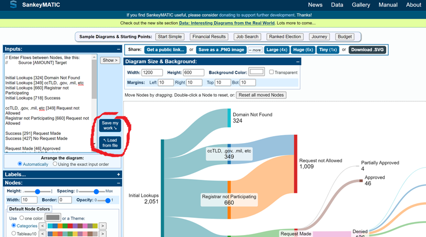 Hi folks – Some on the Standing Committee asked me what tool I used to make the Sankey graph I’ve been playing with. If that doesn’t interest you, please feel free to ignore anything further, as that’s all I’m talking about here 😊 The short answer is: https://sankeymatic.com/ . It’s a free tool created by Steve Bogart, with a great web GUI, and additional source code resources on GitHub. It’s one of many such tools out there, and just happens to be the one I’ve found to be most user friendly. The slightly longer answer is: I took the numbers from ICANN’s January metrics report<https://www.icann.org/en/system/files/files/rdrs-usage-metrics-16feb24-en.pd...>, making some small inferences (such as taking Metric 10 and converting %s to #s, which necessarily introduces minor inaccuracy), and input them into the text format that sankeymatic prefers. Text file attached. You can “Load from file”, select this text file, and play with the chart yourself, or make similar. It’s fun. [cid:image001.png@01DA6FB5.6F912D80] That said – I’ve made a lot of transcriptions by hand, and that means I might make transcription errors. It’d be great to minimize the risk of such errors, and to that end I’ve asked our helpful ICANN staff if we might be able to get .csv (or similar) files of the data they put into the metrics reports. Much easier to copy/paste from a .csv than from the document format. They advised they’re going to see if its possible, and if it is, will share not just with me but with all of us. (Thank you staff!) Hope that answered the questions I’ve been getting, and further hope that my fellow nerds might find it fun (or useful). =) Thanks/cheers, Gabriel