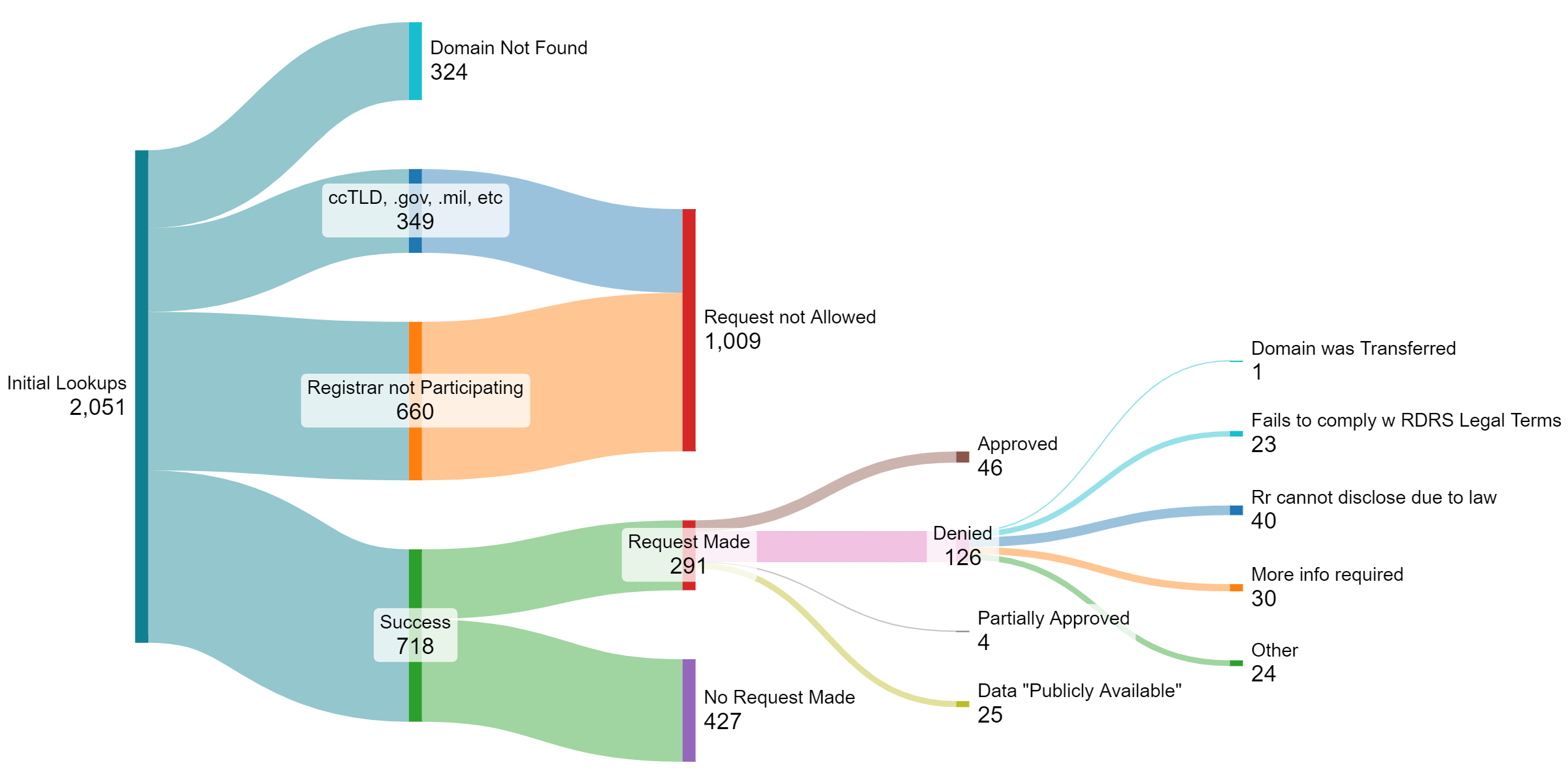 *The slightly longer* answer is: I took the numbers from ICANN’s January metrics report <https://www.icann.org/en/system/files/files/rdrs-usage-metrics-16feb24-en.pd...>, making some small inferences (such as taking Metric 10 and converting %s to #s, which necessarily introduces minor inaccuracy), and input them into the text format that sankeymatic prefers. Text file attached. You can “Load from file”, select this text file, and play with the chart yourself, or make similar. It’s fun.