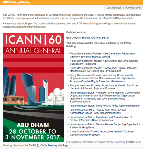 Fellow IPC Members, The GNSO Policy Briefing is now available at https://gnso.icann.org/en/ issues/policy-briefing. Whether or not you are going to iCANN60, this is a very useful snapshot of current policy activity in the GNSO. Greg David A. Olive Senior Vice President Policy Development Support Internet Corporation for Assigned Names and Numbers (ICANN) _______________________________________________ So-ac-sg-cleaders mailing list So-ac-sg-cleaders@icann.org https://mm.icann.org/mailman/listinfo/so-ac-sg-cleaders