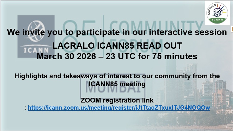 [lac-discuss-en] REMINDER- LACRALO ICANN 85 READOUT- MARCH 30TH - 33 UTC for 75 minutes
