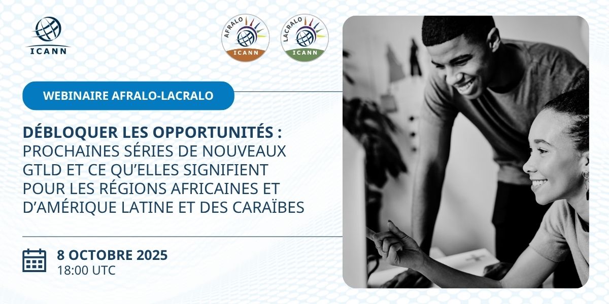 [[-- Translated text (en -> es) --]] ** Por favor regístrate y comparte esta invitación entre tus ALS y miembros ** Registro de Zoom: https://icann.zoom.us/webinar/register/WN_AtnYSH9BST2n994MH8pHvg [icann.zoom.us] <https://urldefense.com/v3/__https:/icann.zoom.us/webinar/register/WN_AtnYSH9...> Interpretación en inglés, francés, español, árabe y portugués Estimados, Invitación para asistir al seminario web conjunto AFRALO-LACRALO “Desbloqueando oportunidades: Próximas rondas de nuevos gTLD y lo que significan para las regiones de África y América Latina y el Caribe” el miércoles 8 de octubre de 2025 de 18:00 a 20:00 UTC. Este seminario web pretende ser informativo, de concientización y educativo sobre la próxima ronda de nuevos gTLD, el Programa de Apoyo al Solicitante (PAS) y la asistencia brindada para brindar apoyo a las comunidades desatendidas. Además, el seminario web presentará casos prácticos regionales que describen la historia de un TLD, incluyendo sus antecedentes y objetivos comerciales. Invitación al seminario web conjunto AFRALO-LACRALO « Explotar las oportunidades: Prochaines séries de nouveaux gTLD et leurs implications pour les régions Afrique et Amérique latine et Caraïbes » le mercredi 8 de octubre de 2025 de 18h00 a 20h00 UTC. Este seminario web tiene información, educación y sensibilización sobre las cadenas de la serie de nuevos gTLD, el Programa de apoyo a los candidatos (PSC) y la ayuda proporcionada a las comunidades mal merecedas. Los estudios de casos regionales específicos presentan también la historia de un TLD, su contexto y sus objetivos comerciales. Agenda: https://icann-community.atlassian.net/wiki/x/AQATHg [icann-community.atlassian.net] <https://urldefense.com/v3/__https:/icann-community.atlassian.net/wiki/x/AQAT...> Registro de Zoom: https://icann.zoom.us/webinar/register/WN_AtnYSH9BST2n994MH8pHvg [icann.zoom.us] <https://urldefense.com/v3/__https:/icann.zoom.us/webinar/register/WN_AtnYSH9...> Interpretación: inglés, francés, español, árabe y portugués Importante: tenga en cuenta la sala de zoom, ya que se le enviará un enlace único. Gracias. Atentamente, Personal general Personal de políticas de la ICANN en apoyo a la comunidad At-Large www.icann.org<http://www.icann.org>