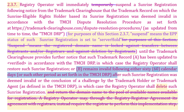 Registry Operator will immediately suspend a Sunrise Registration following notice from the Trademark Clearinghouse that the Trademark Record on which the Sunrise-Eligible Rights Holder based its Sunrise Registration was deemed invalid in accordance with the TMCH Dispute Resolution Procedure as set forth at https://trademark-clearinghouse.com/dispute-resolution-procedures/ <https://urldefense.com/v3/__https://trademark-clearinghouse.com/dispute-reso...> (as updated from time to time, the “TMCH DRP”) (for purposes of this Section 2.3.7, “suspend” means the EPP status of such Sunrise Registration is set to “serverHold until the Trademark Clearinghouse provides further notice that such Trademark Record (A) has been updated to <verified> in accordance with the TMCH DRP, in which case the Registry Operator shall restore such Sunrise Registration; or (B) remains invalid following either sixty (60) calendar days (or such other period as set forth in the TMCH DRP) after such Sunrise Registration was deemed invalid or the conclusion of a challenge by the Trademark Holder or Trademark Agent (as defined in the TMCH DRP)_, whichever is __later__earlier___, in which case the Registry Operator shall delete such Sunrise Registration *and return the domain name to the pool of available names available for registration*.